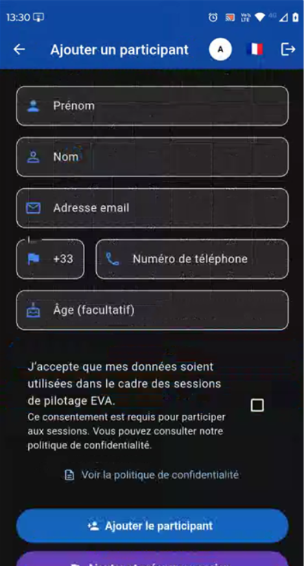 Depuis l'Accueil, cliquez sur "Ajouter un participant". Renseignez les informations - Votre client doit vous donner son autorisation pour la collecte de données : cocher le consentement, puis: