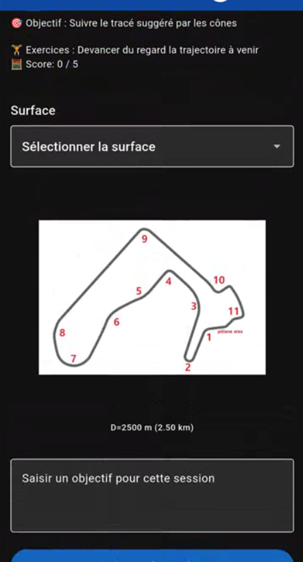 - Vous pourrez définir et consigner vos objectifs de séance dans ce menu (après avoir renseigné les conditions de piste et d'adhérence suivant le type de voiture sélectionné)
