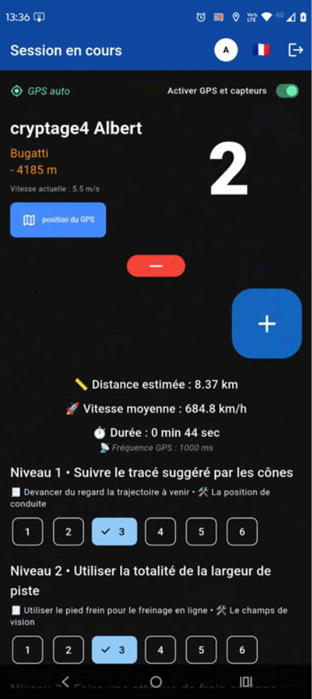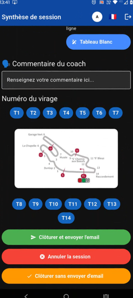 Ce module est composé d'un commutateur du GPS pour le comptage automatique des tours (franchissement de la ligne de départ), d'un compteur de tour utilisable manuellement (+ et -), de la grille multiniveaux pour vos évaluations et de différentes informations utiles comme un compteur de temps. Le Bouton "Pause" permet d'accéder aux vues de chaque virage du circuit pour vos coaching. Vous pouvez enrichir vos commentaires durant la session