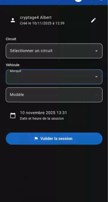 Passez ensuite a "Créer une session" pour sélectionné le circuit, la marque le model de voiture et la date avant de valider votre sélection: (photo)